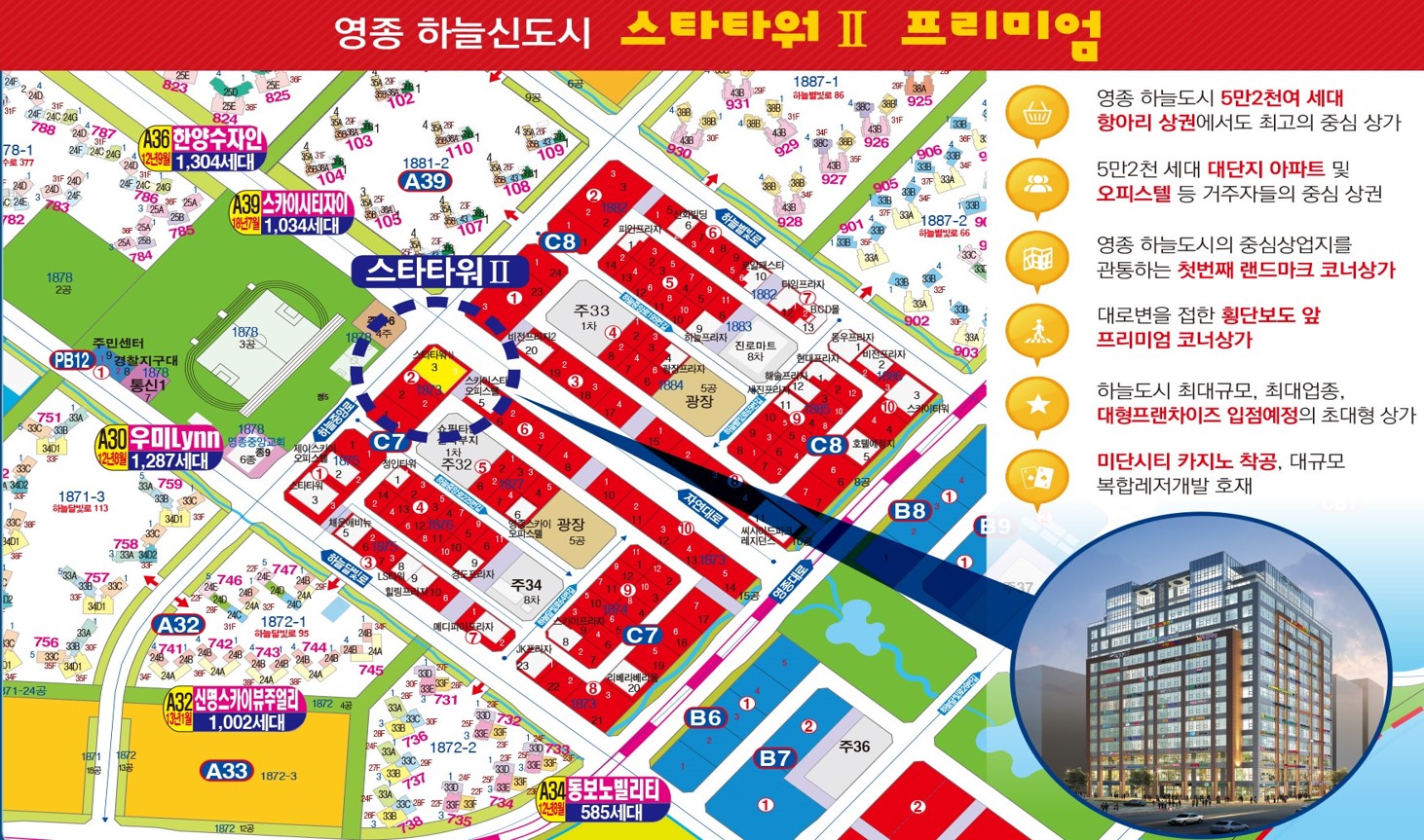 - 3만 5천 세대가 형성될 하늘도시 거주지역으로 향하는 모든 차량들이 지나가는 길목의 가장 첫번째 15층 최대 규모의 프라자 상가